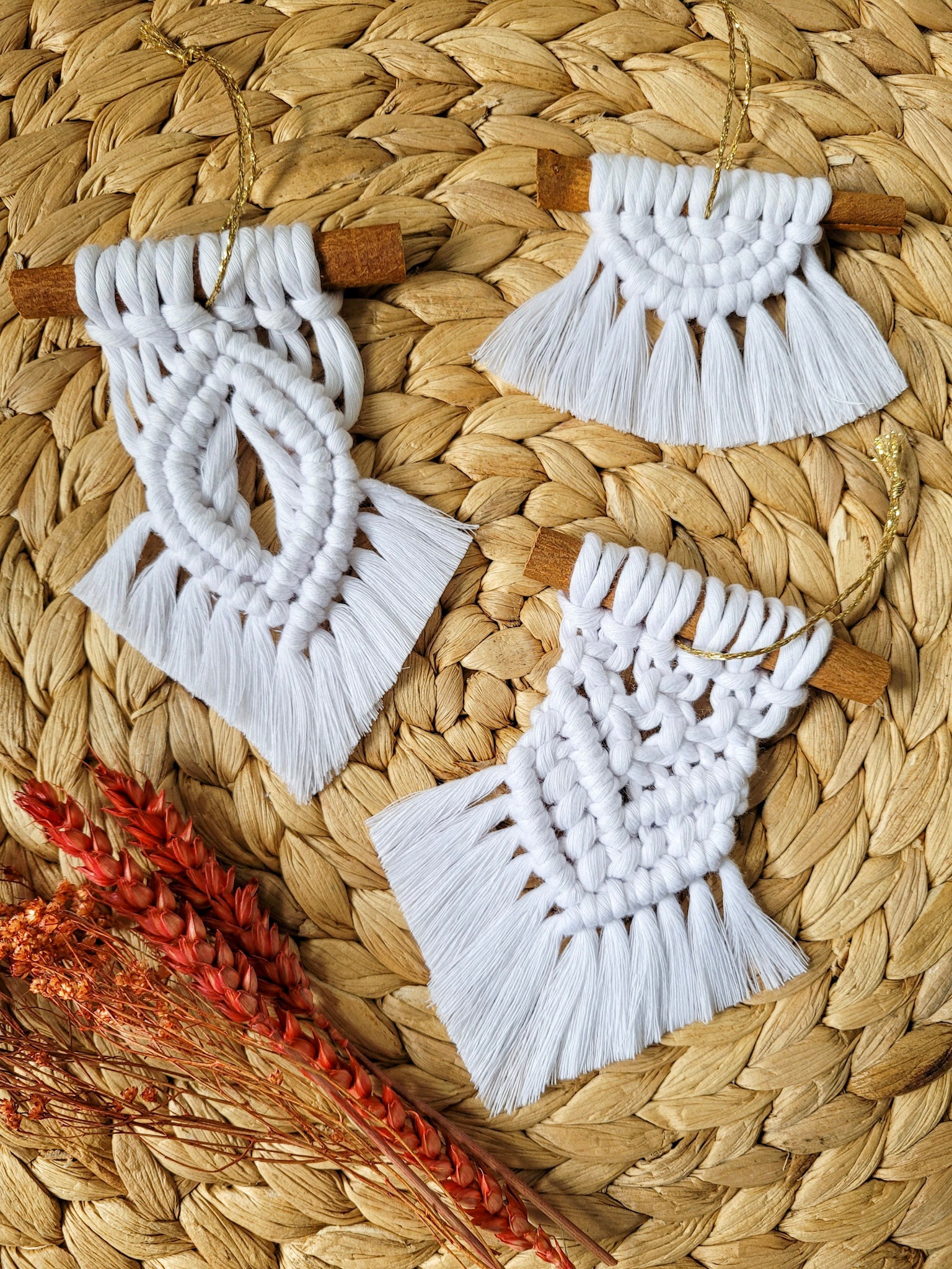 Vous voulez ajouter une petite touche bohème à votre sapin? Ajoutez-y ces trois ornements en macramé suspendus à des bâtons de cannelle — une touche délicate, naturelle et odorante pour votre sapin!